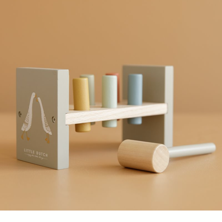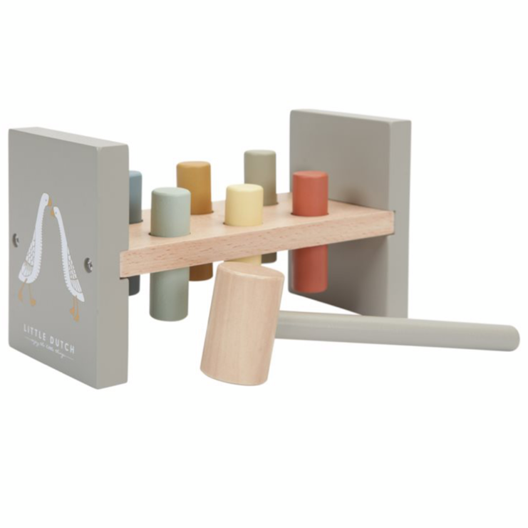 Parqu’entre un et deux ans, les enfants adorent taper autant le faire en jouant ! Avec ce marteau, ils devront taper avec le marteau pour enfoncer les 6 bâtonnets de couleur dans le mini établi en bois.