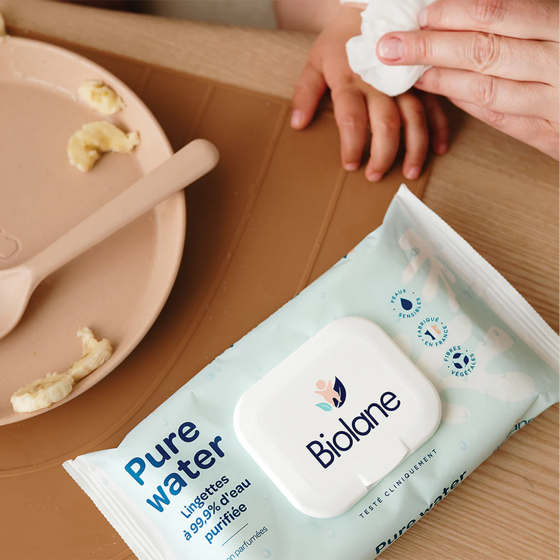 - Les lingettes Pure Water Biolane nettoient délicatement et en un seul geste le siège, le corps et le visage de votre bébé.