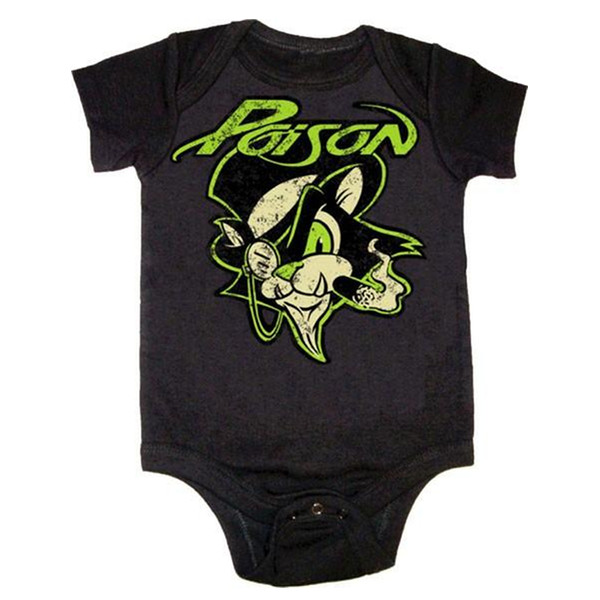 Un body noir à manches courtes, pour bébé, avec le visuel représentant un chat avec un cigare chapeauté et portant un monocle (Evil Eye) ainsi que le logo de Poison dans des tons verts et blancs