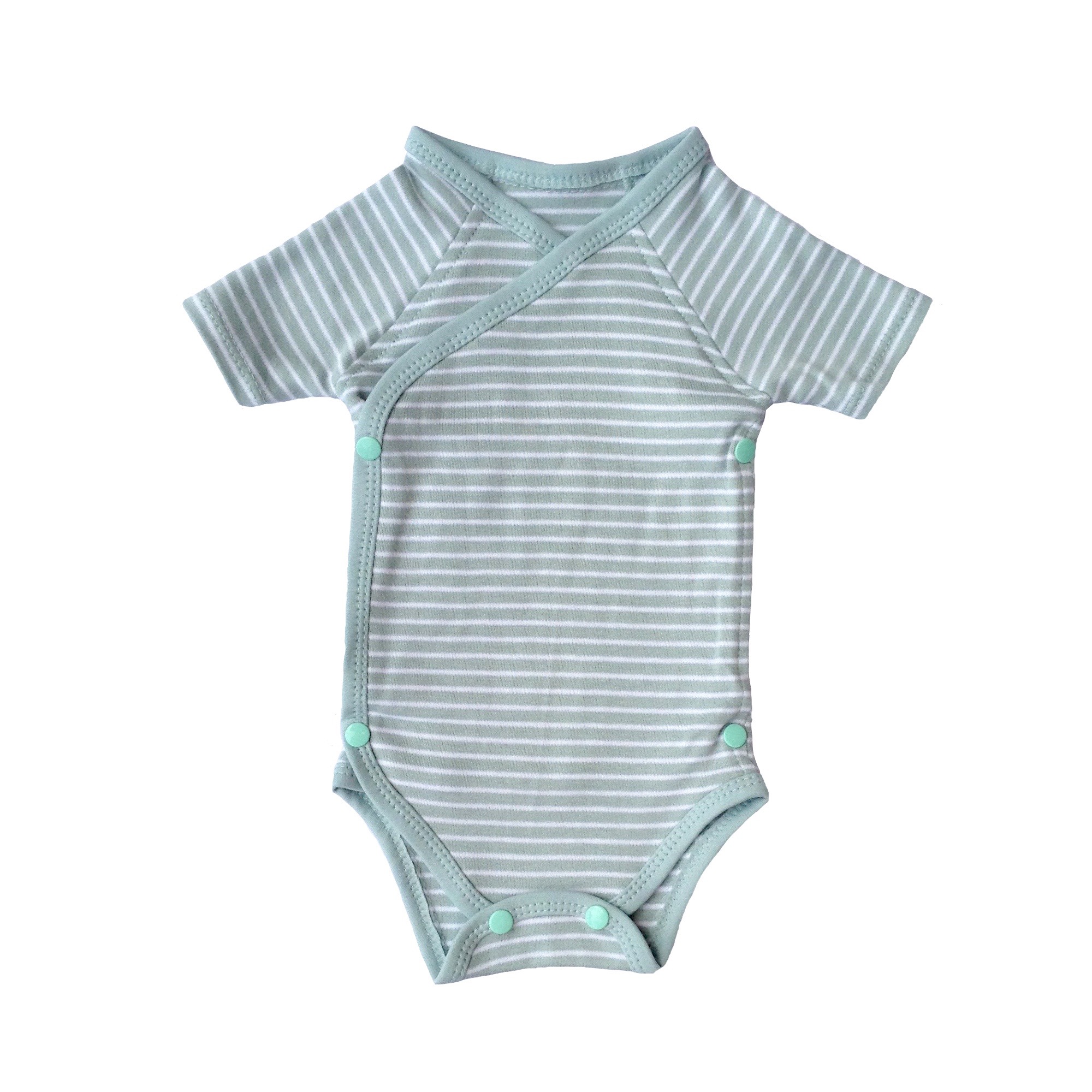 Body en jersey rayé tout doux de coton biologique GOTS, avec ouverture croisée à boutons pressions. Fabrication 100% française 🇫🇷. Option prénom à broder au fil écru.