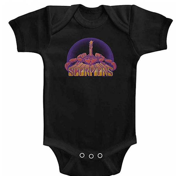 Une grenouillère pour bébé, à manches courtes, de couleurs noire avec le scoprion logo du groupe dans des tons jaunes, violets et ose imprimé sur le devant.