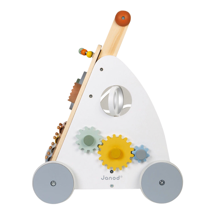 En voici un super chariot en bois qui permet l’apprentissage des premiers pas mais pas que ! Il propose également tout plein d’activités pour faire une pause et bien s’amuser !