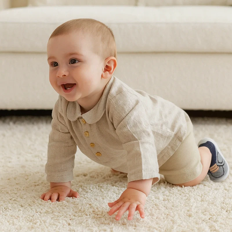 Grâce à leur semelle extérieure en caoutchouc naturel antidérapant, ces chaussures offrent une excellente adhérence sur toutes les surfaces. Que bébé marche à la maison, au parc ou sur la terrasse, ses pieds restent bien stables, limitant les risques de glissades.