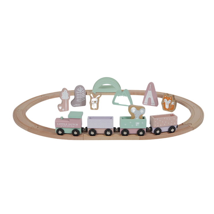 Un joli petit circuit de train en bois, aux couleurs douces, pour que votre enfant parte à la découverte de mondes inconnus et développe son imagination.