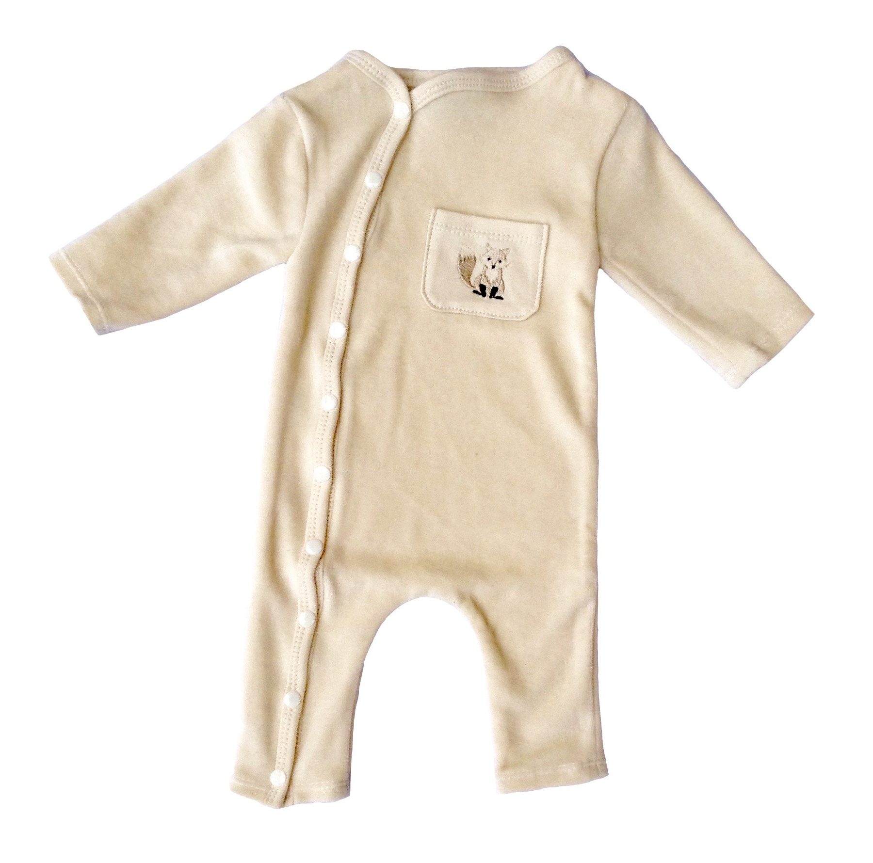 Petite combinaison sans pied en velours de coton naturel tout doux biologique GOTS, avec ouverture devant à boutons pressions. Fabrication 100% française. Broderie à la poche. Tailles 3 mois ou 6 mois.