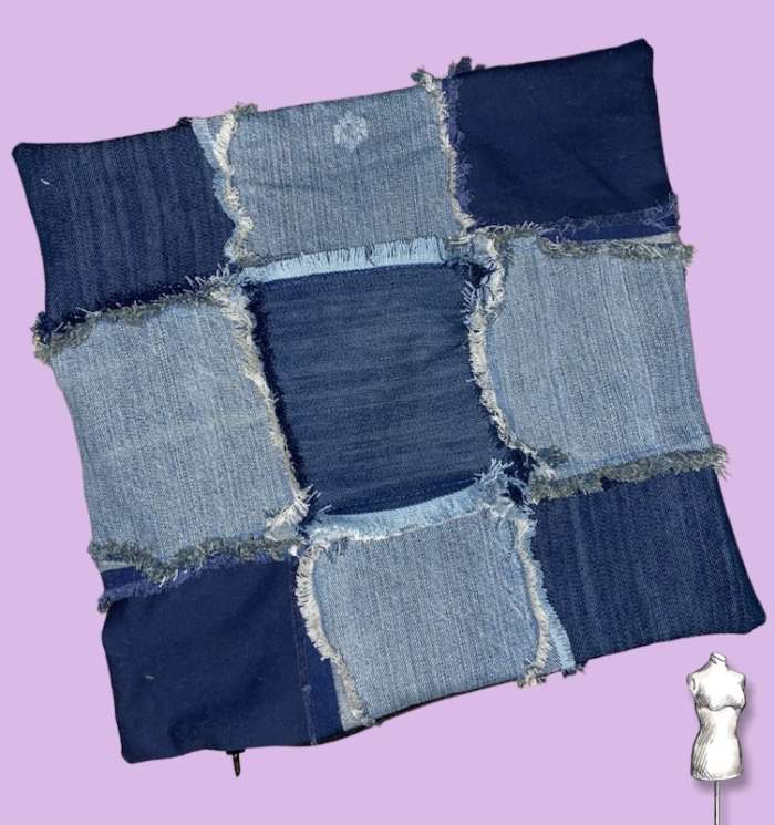Un patchwork composé de carrés de jeans recyclés pour au final devenir une superbe housse de coussin décorative pour mètre sur votre canapé