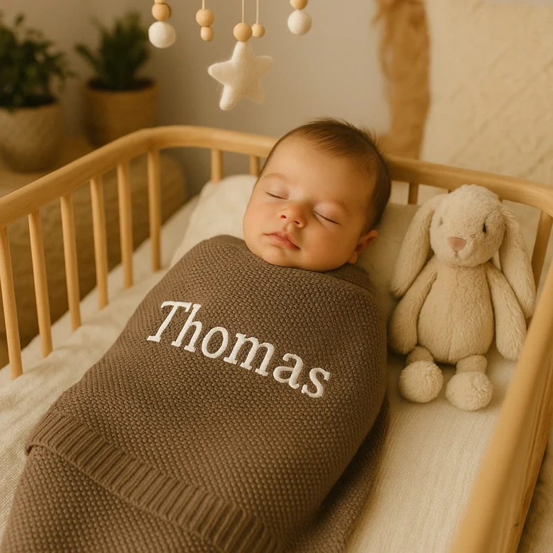 Chaque couverture est personnalisée avec le prénom de bébé, brodé avec précision et délicatesse. Cette touche unique en fait un cadeau de naissance idéal, plein d’émotion et de sens.