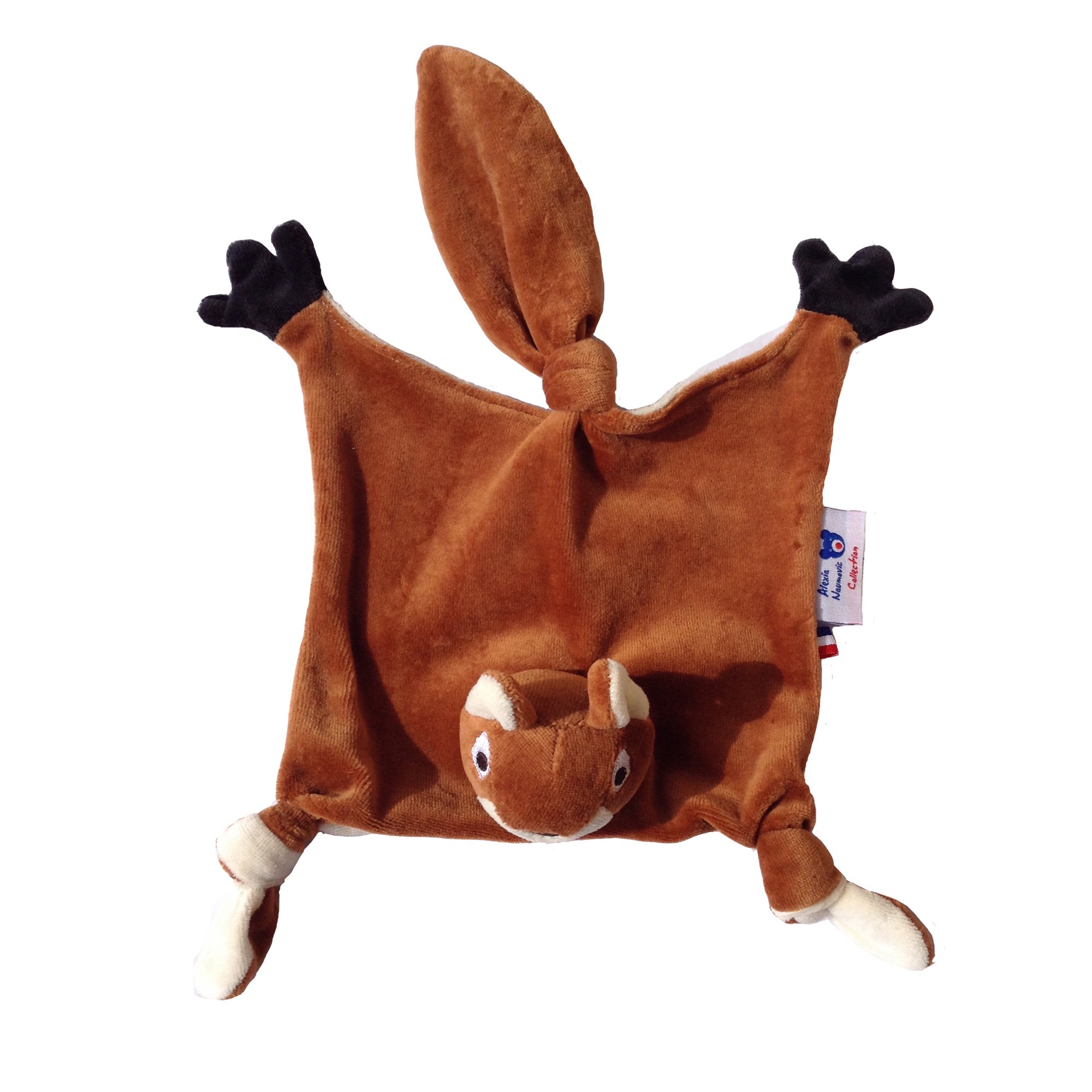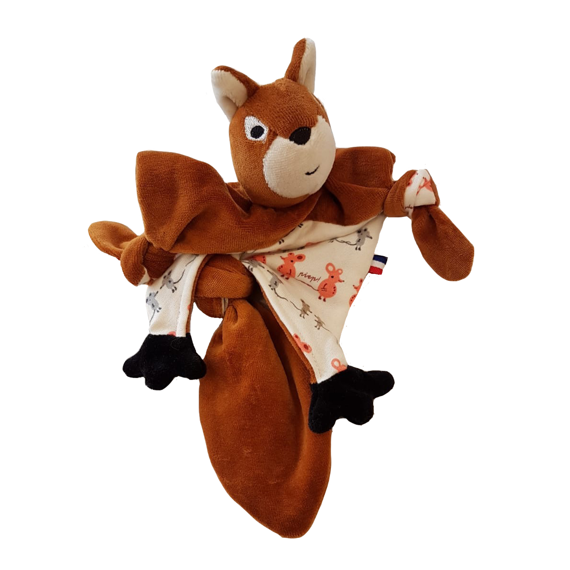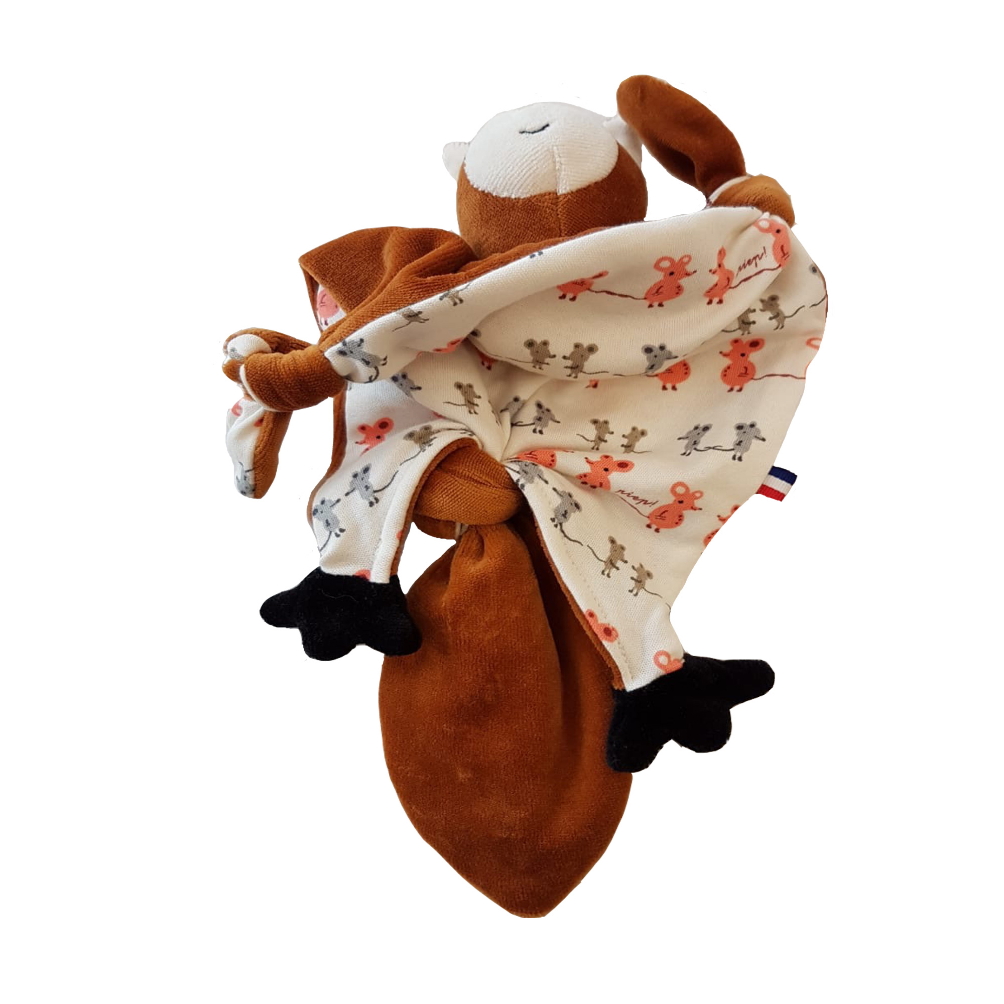 Le doudou écureuil Polatouche en velours de cotons biologiques et interlock avec motifs souris certifiés GOTS, est à offrir dès la naissance pour fille ou garçon. Fabrication 100% française dans notre atelier situé dans les Yvelines. Un cadeau éthique tout doux et écologique pour les nuits douces de bébé.