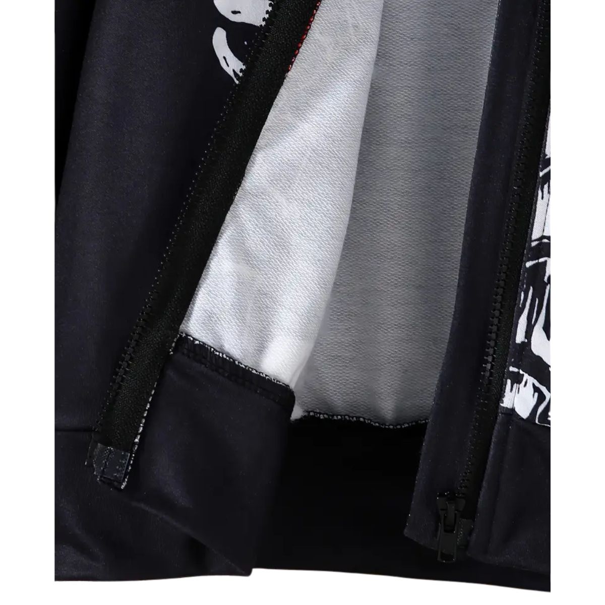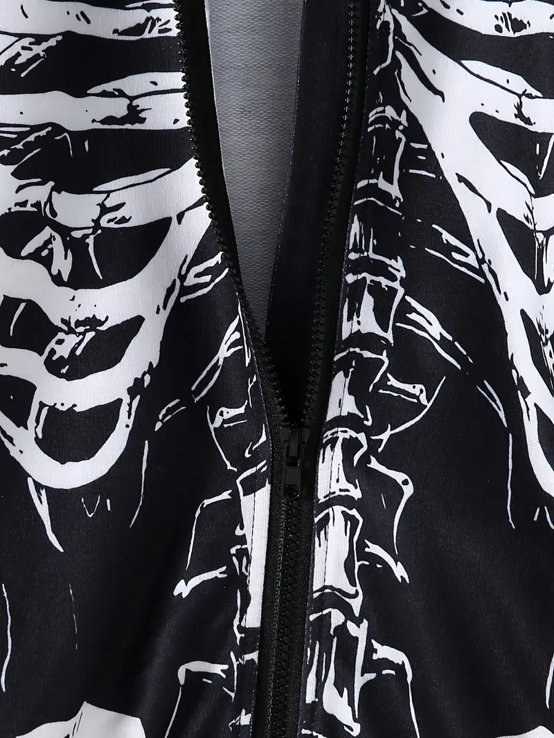 - Une veste noire zippée avec un imprimé squelette blanc fun et contrasté