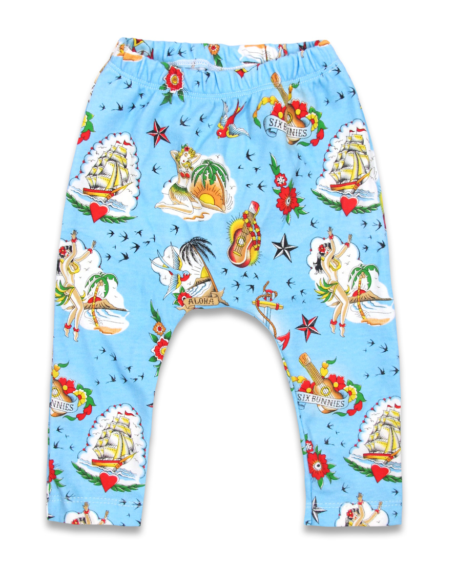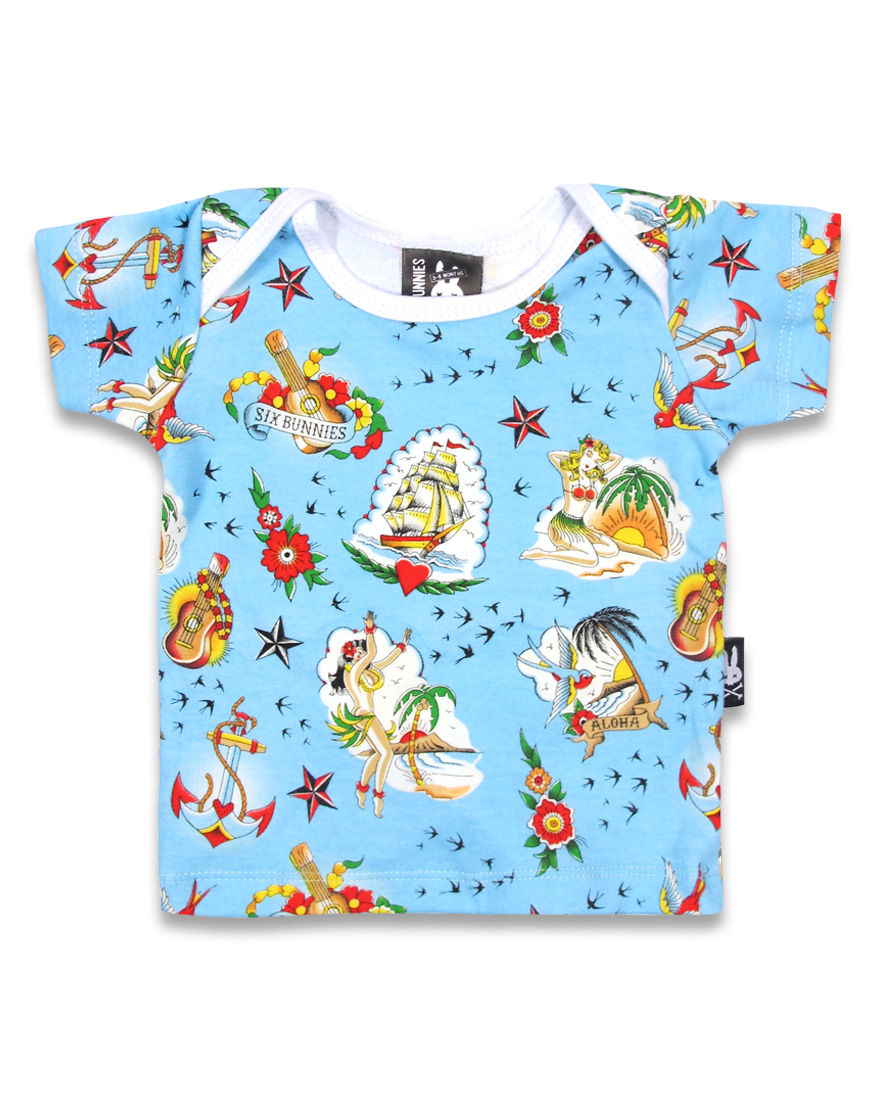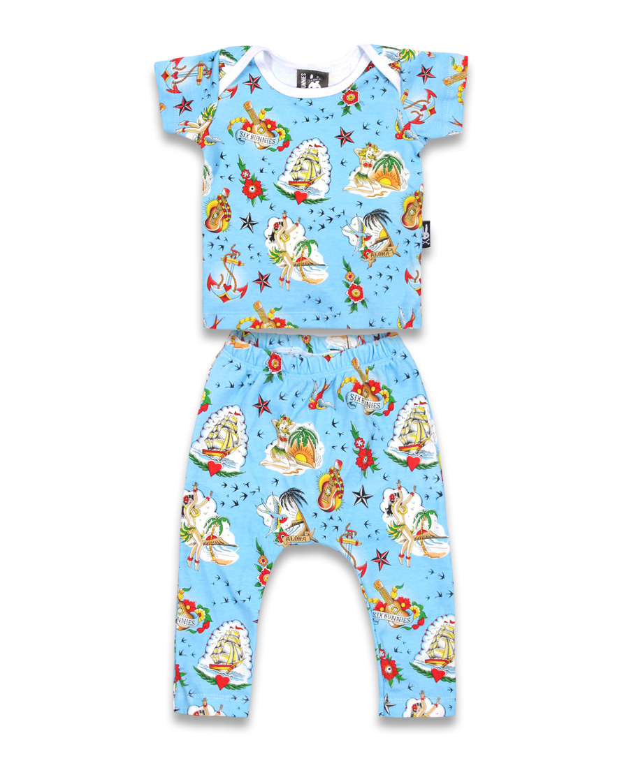 Un ensemble comprosé d’un tee-shirt pour bébé de couleur bleue bordé de blanc et d’un pantalon coupe sarouel élastiqué à la taille, le tout imprimé de motifs inspirés du tatouage old school.