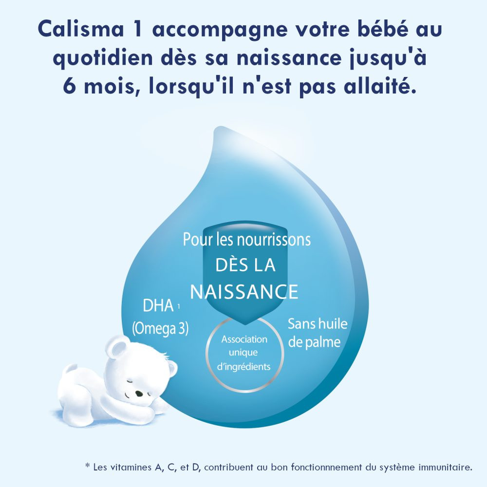 - Calisma 1 est une formule qui répond aux besoins nutritionnels spécifiques de votre bébé lorsqu’il n’est pas allaité, de la naissance à 6 mois. Conformément à la réglementation.