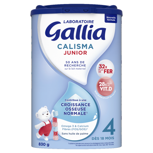 - GALLIA CALSIMA JUNIOR contient 32 x PLUS DE FER que dans le lait de vache. (Par rapport au lait de vache demi-écrémé et entier, UHT, Anses, Ciqual, 2020.