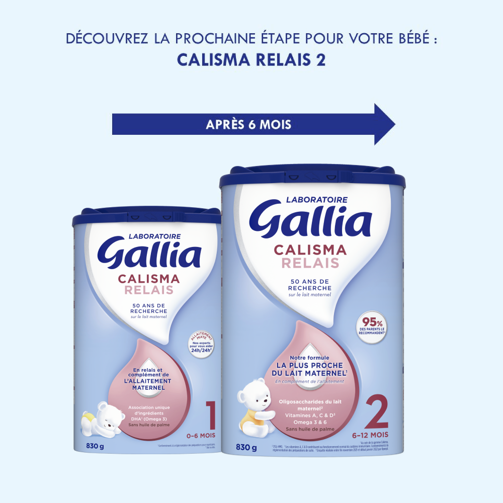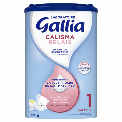 - GALLIA CALISMA RELAIS 1er âge 830g De 0 à 6 mois, une association unique d’ingrédients avec notamment du DHA (Omega 3)(Conformément à la réglementation des préparations pour nourrissons.)