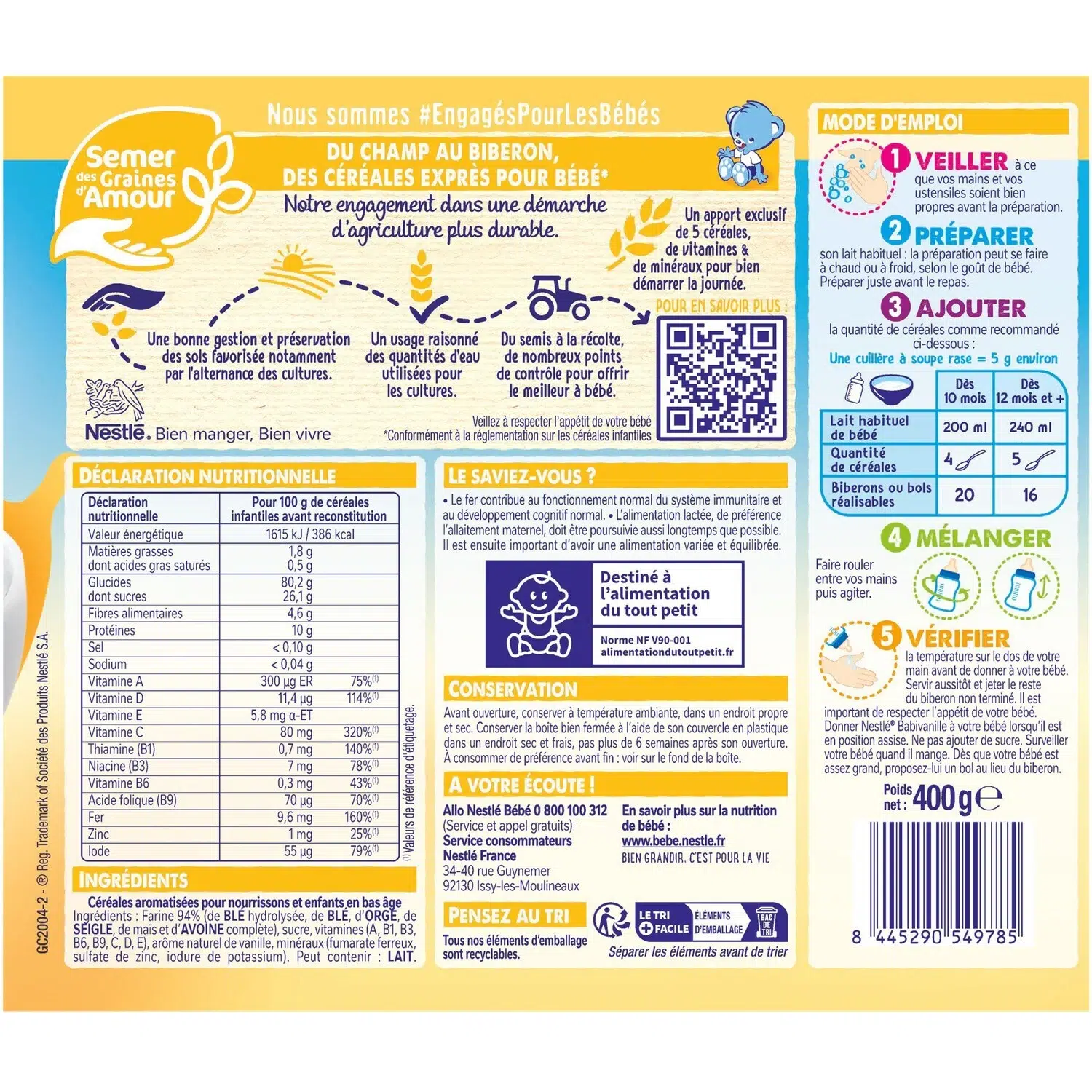 Ingrédients : Farine 94% (de BLE hydrolysée, de BLE, d’ORGE, de SEIGLE, de maïs et d’AVOINE complète), sucre, vitamines (A, B1, B3, B6, B9, C, D, E), arôme naturel de vanille, minéraux (fumarate ferreux, sulfate de zinc, iodure de potassium). Peut contenir : LAIT.