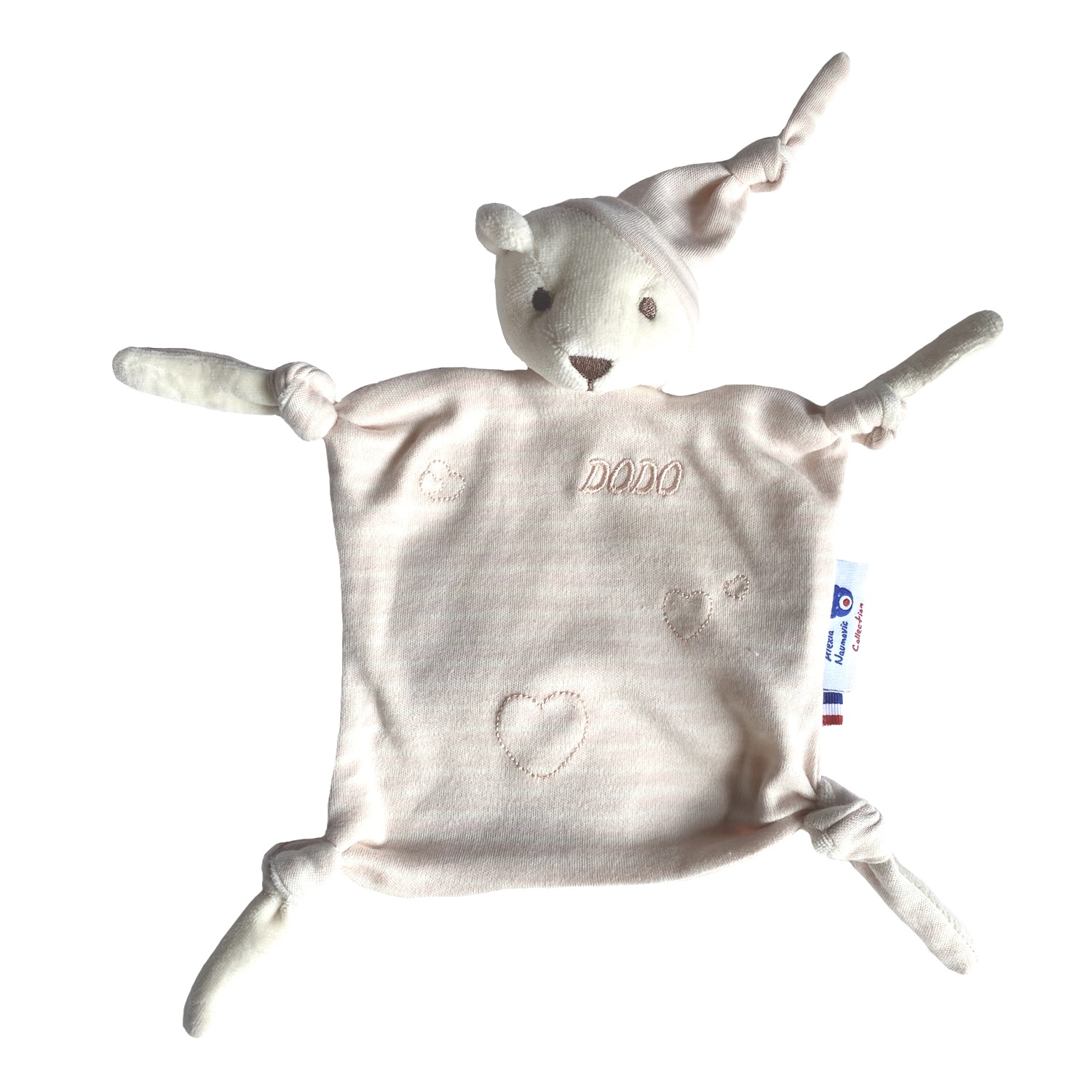 Doudou ours en jersey rayé de coton biologique certifié GOTS, brodé « Dodo » avec des petits coeurs, est à offrir dès la naissance, pour fille ou garçon. Fabrication 100% française dans notre atelier situé dans les Yvelines en région de Paris. Un cadeau éthique tout doux et écologique pour les nuits douces de bébé.