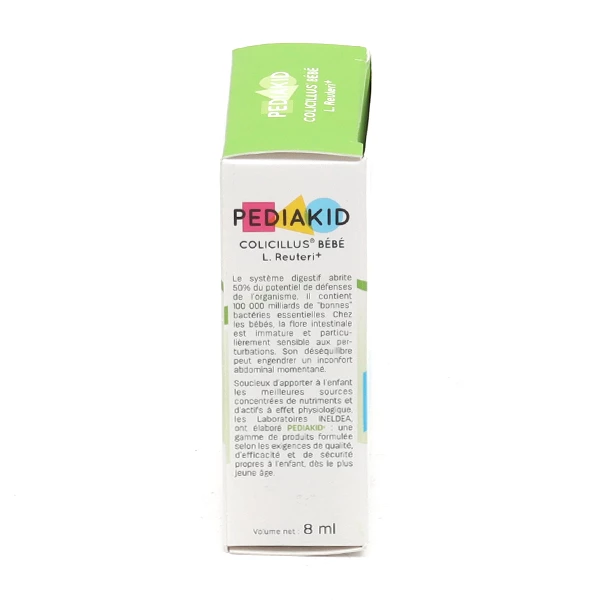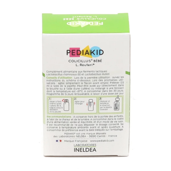- Technologie brevetée – Afin d’agir favorablement sur l’organisme, les ferments lactiques doivent résister aux conditions de stockage dans le produit et aux sucs digestifs après ingestion pour coloniser l’intestin. Pediakid Colicillus Bébé L. Reuteri+ a été élaboré à partir de deux souches de ferments rigoureusement sélectionnées pour satisfaire de façon optimale à ces critères et faisant l’objet de nombreuses publications scientifiques chez le nourrisson.