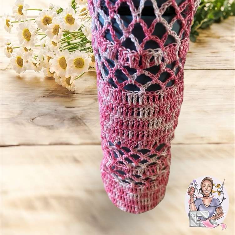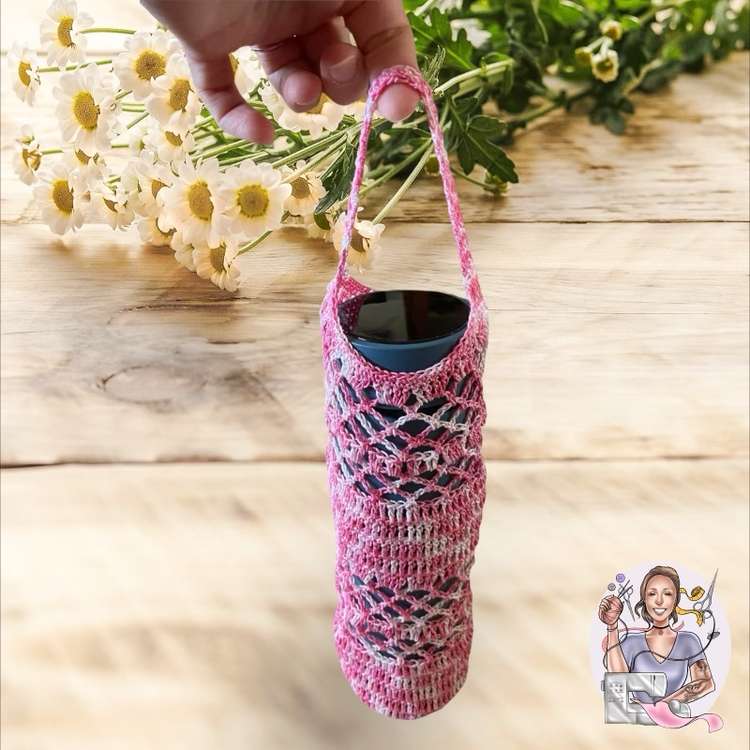 Magnifique, porte, gourde réalisé au crochet avec un fil de coton, de couleur rose/blanc