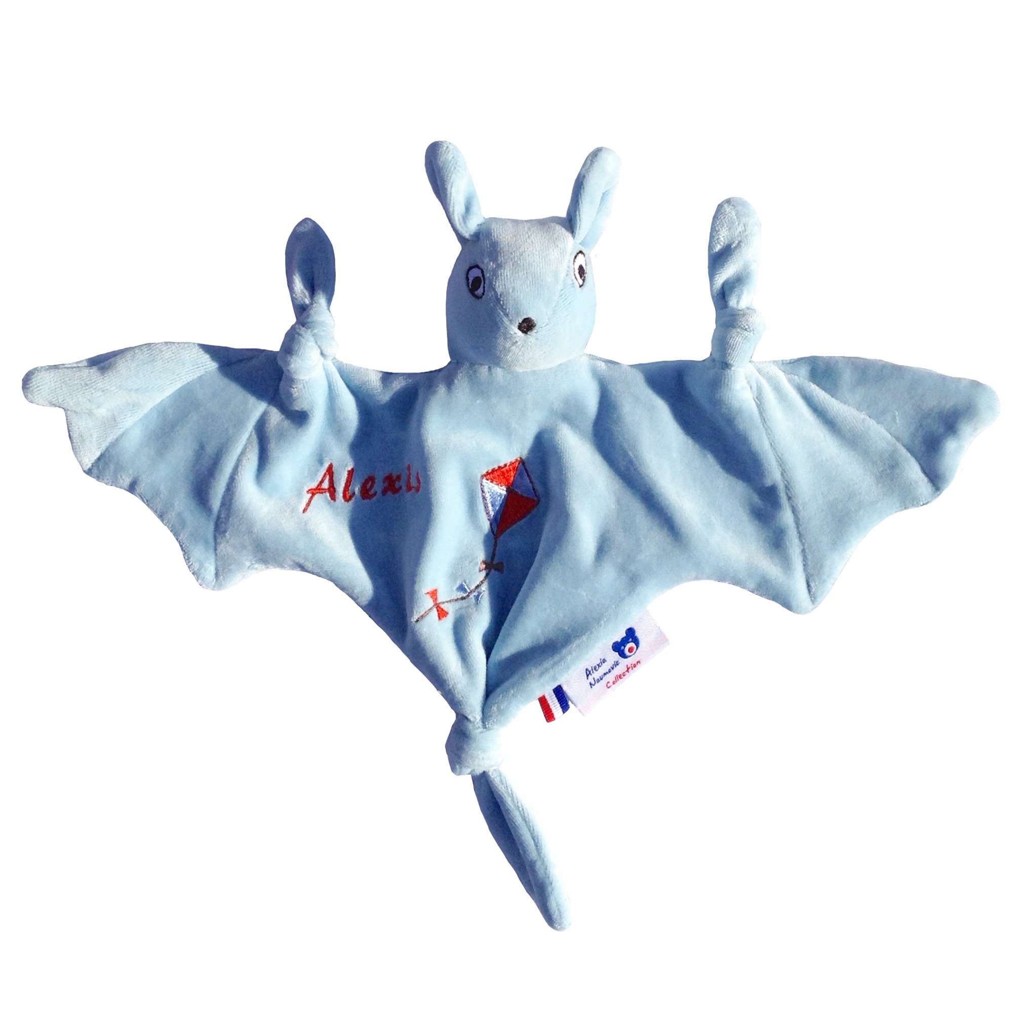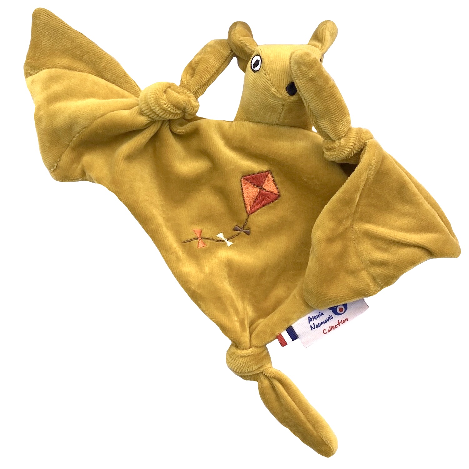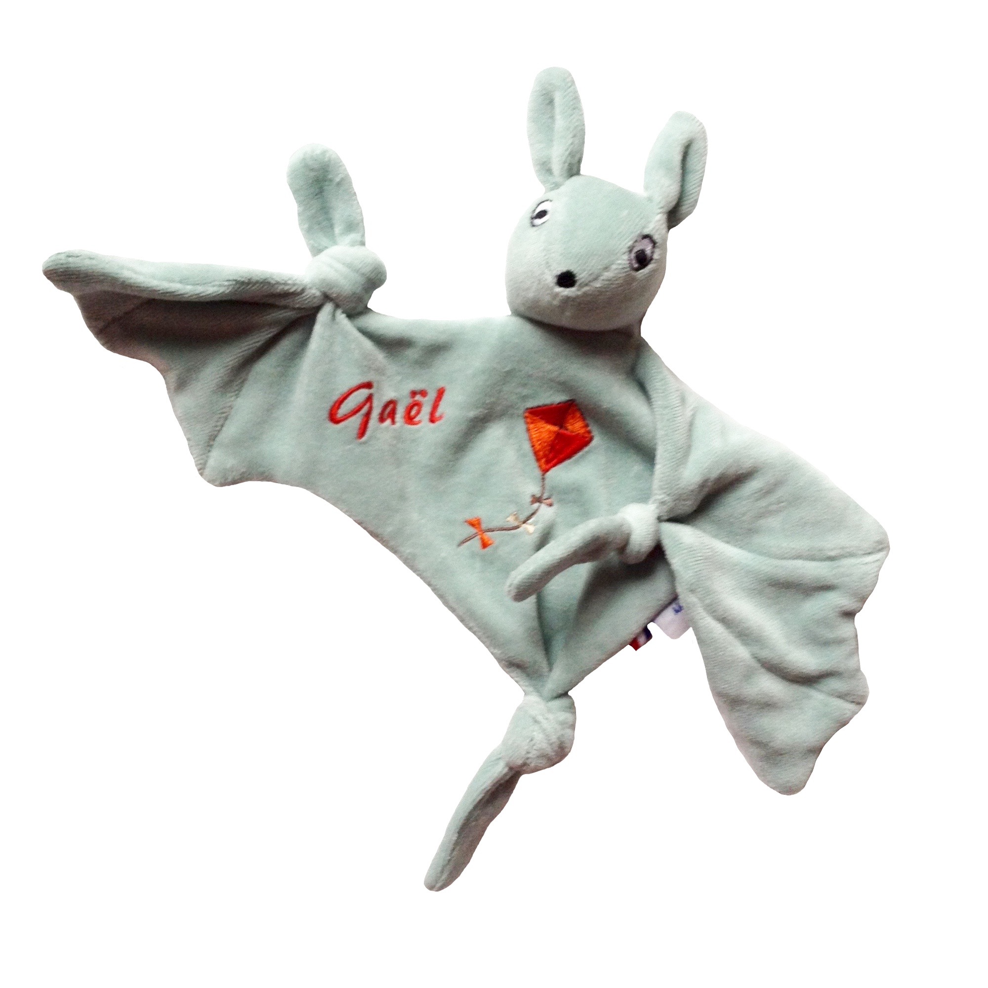 Doudou chauve souris prénommée Roussette en velours de coton biologique certifié GOTS, avec sa broderie est à offrir dès la naissance, pour fille ou garçon. Fabrication 100% française dans notre atelier situé dans les Yvelines. Un cadeau éthique tout doux et écologique pour les nuits douces de bébé.