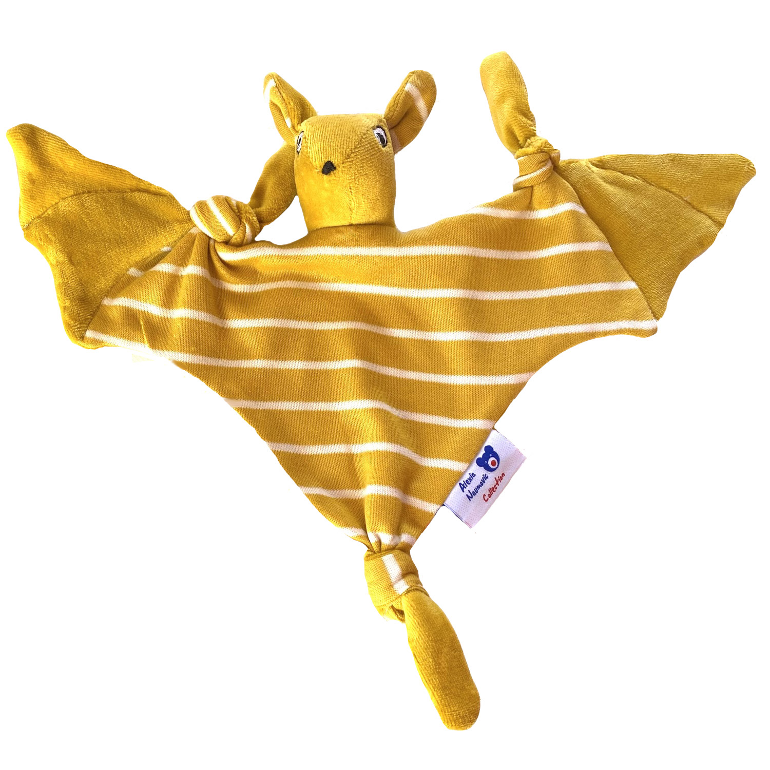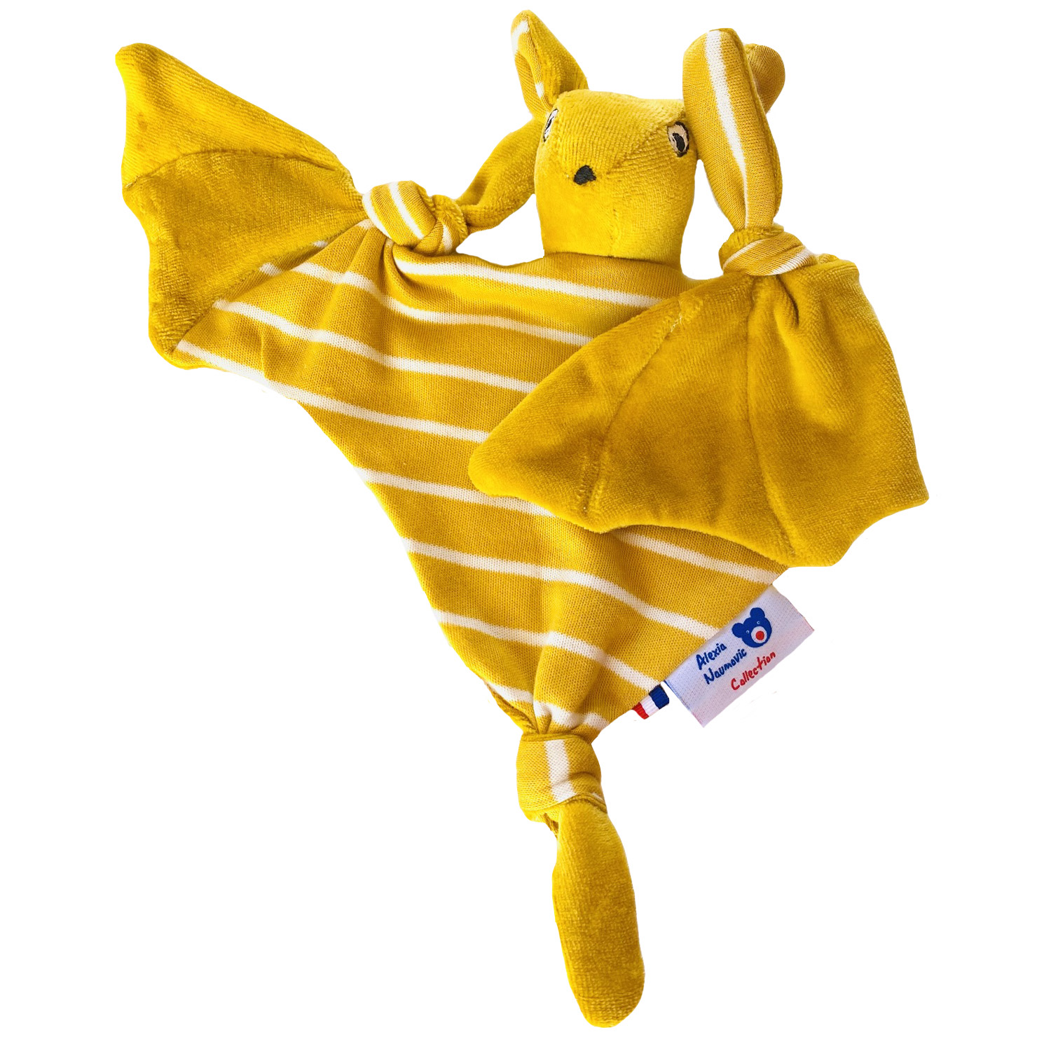 Doudou chauve souris prénommée Roussette en velours et interlock rayé de cotons biologiques certifiés GOTS, est à personnaliser pour fille ou garçon. Fabrication 100% française dans notre atelier situé dans les Yvelines. Un cadeau éthique tout doux et écologique pour les nuits douces de bébé.