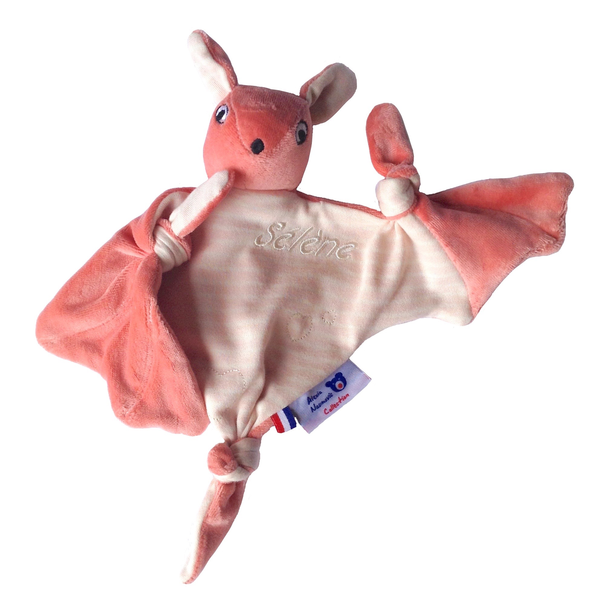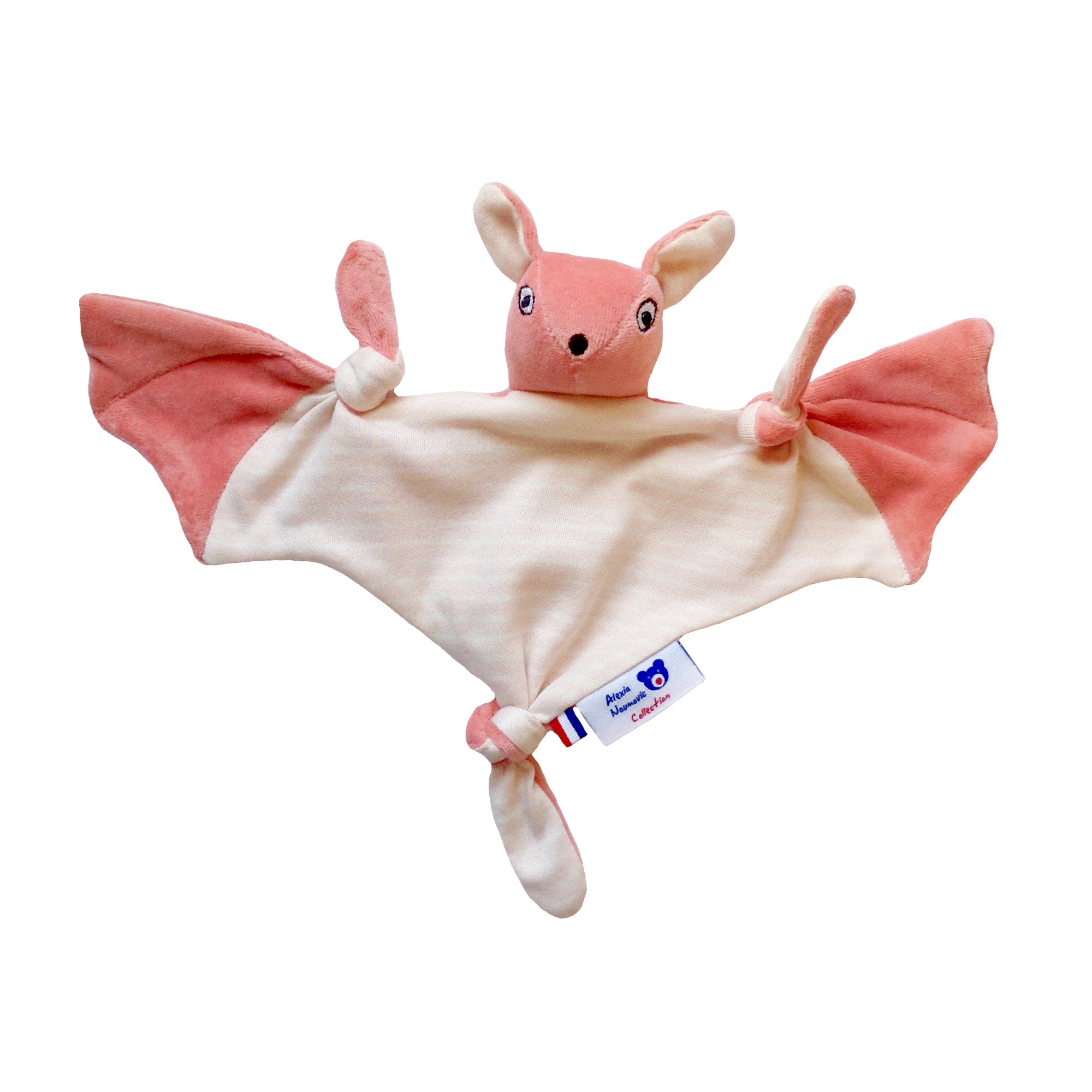 Doudou chauve souris prénommée Roussette en velours et interlock rayé de cotons biologiques certifiés GOTS, est à personnaliser pour fille ou garçon. Fabrication 100% française dans notre atelier situé dans les Yvelines. Un cadeau éthique tout doux et écologique pour les nuits douces de bébé.