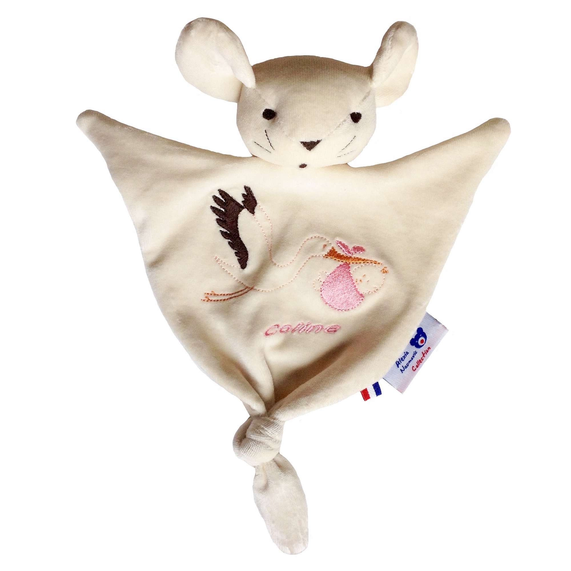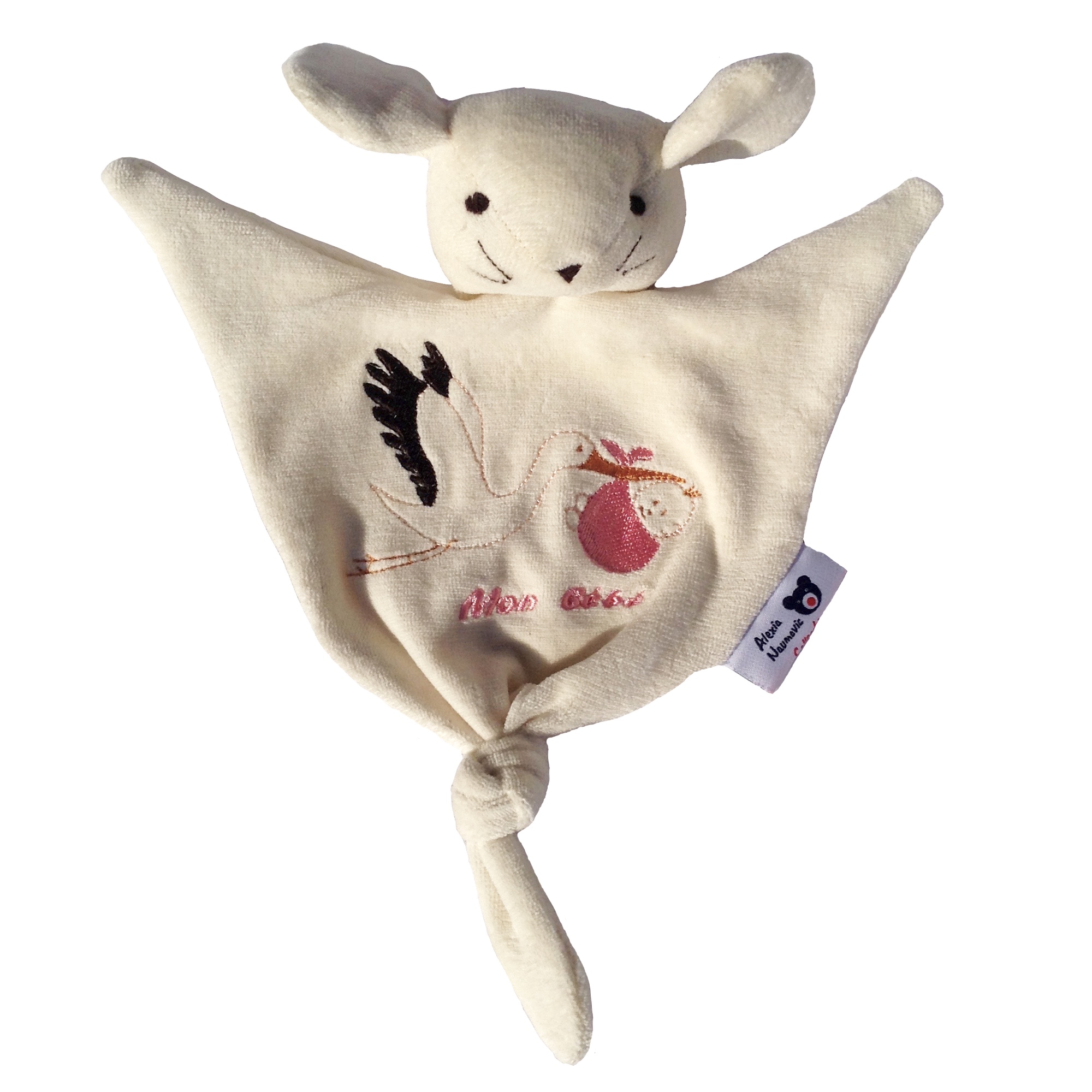 Le doudou souris bio avec motif cigogne à la broderie est fabriqué 100% en région parisienne en notre atelier situé dans les Yvelines. C’est un doudou en coton biologique de couleur naturelle, à offrir dès la naissance, avec broderie fille ou garçon. Un cadeau éthique, écologique, original et durable pour bébé branché à offrir comme cadeau de naissance. On peut personnaliser le doudou au prénom de l’enfant la place de l’inscription « Mon bébé ».