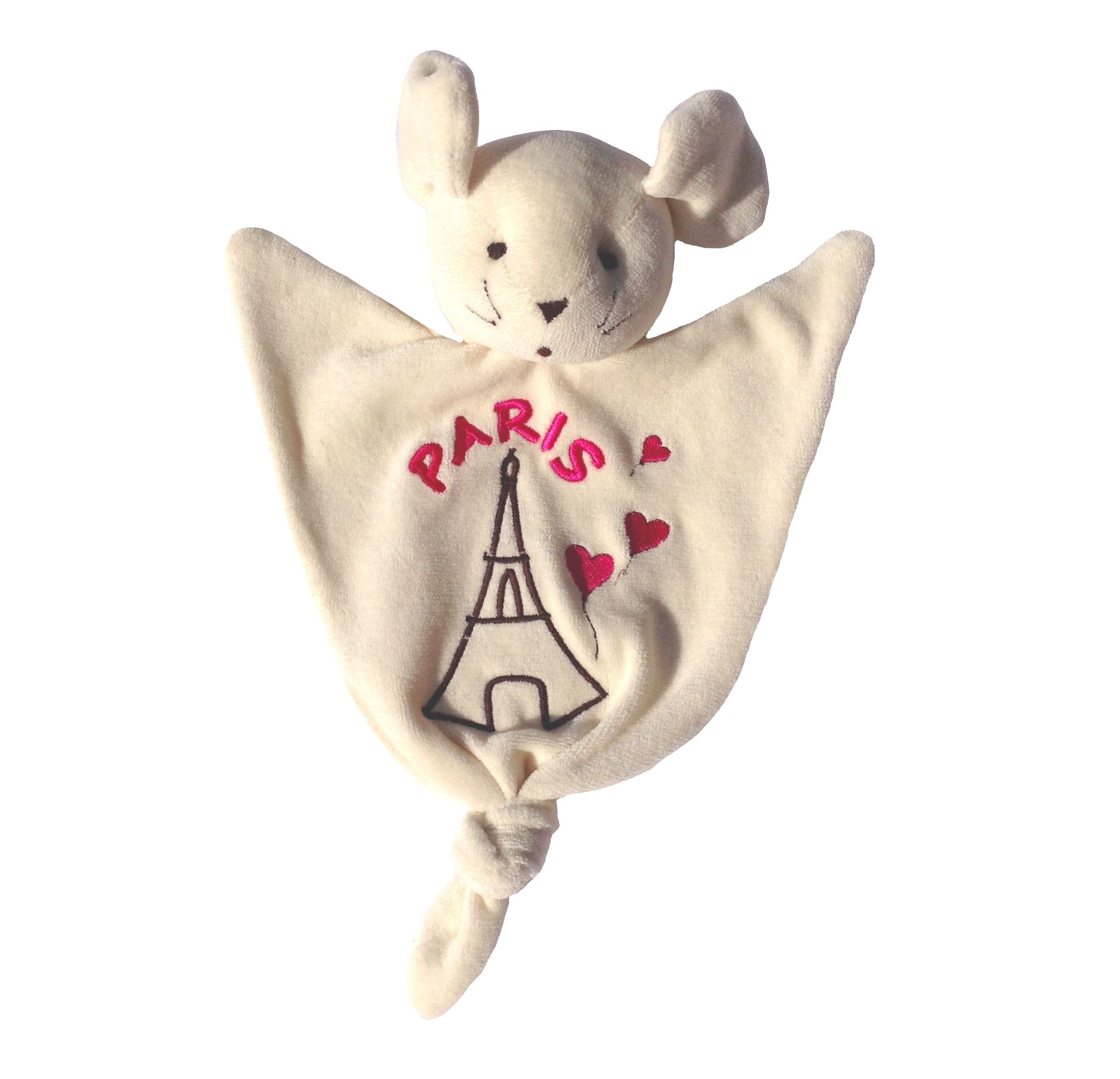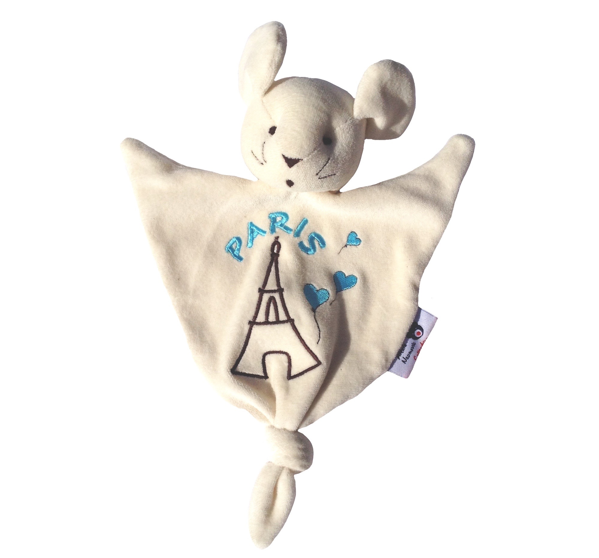 Le doudou souris bio à l’effigie de PARIS est fabriqué 100% en région parisienne dans notre atelier situé dans les Yvelines. Ce doudou est en coton biologique de couleur naturelle, à offrir dès la naissance, pour fille ou garçon, avec broderie dans le coloris de son choix. Un cadeau éthique, écologique, original et durable pour bébé branché ou pour offrir comme cadeau de naissance à un petit bébé de province ou à l’étranger, pour lui rappeler que son doudou est bien fabriqué en France et lui donner envie de visiter PARIS. Les touristes l’adorent !