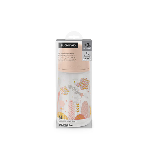 Biberon Suavinex . Avec la tétine en silicone anatomique réversible SX Pro, la valve à débit lent et la valve anti-colique. Pour les bébés de +3 mois Respecte le développement bucco-dentaire de bébé. La tétine anatomique réversible SX Pro est l’étape ultime vers une alimentation plus naturelle. Elle maintient la langue dans la même position qu’au sein. Silicone Sablé Ultra – Doux. Imite la texture et la consistance du mamelon maternel. Permet une flexibilité maximale pour s’adapter au palais