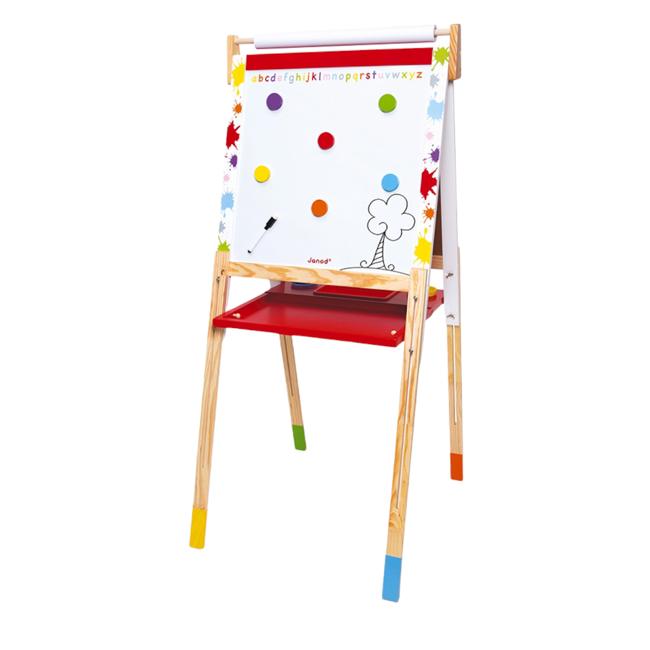 Une face tableau blanc magnétique, idéale pour les feutres et les magnets. L’autre face en ardoise pour dessiner à la craie. Et cerise sur le gâteau, un rouleau de papier au sommet !