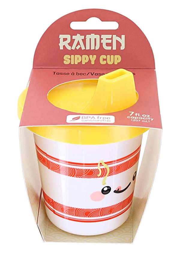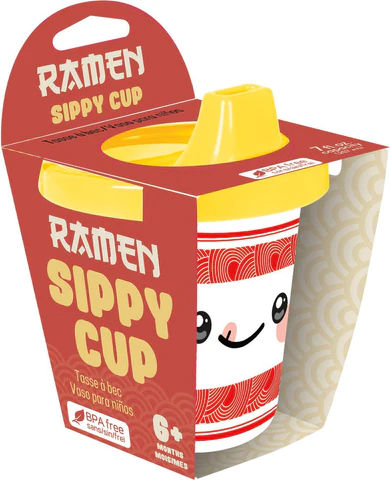 Une tasse à bec tout droit inspirée des bols de nouilles ramen. Elle possède un couvercle jaune et un contenant blanc à bandes rouges ainsi qu’un visage kawaii se léchant les babines sur une face.