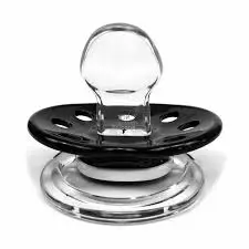 La sucette est de couleur noire avec un anneau transparent et le logo du groupe imprimé en blanc